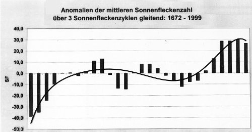 Wenn wir uns auf dieser Grundlage jetzt die Klimaentwicklung noch einmal anschauen, dann heißt das: Im 17. Jahrhundert war es kalt und im 19. Jahrhundert war es kalt. Im 18. und im 20. Jahrhundert war es warm: Entsprechend dieser rund 200jährigen Schwingung müssen wir erwarten, daß die Sonnenaktivität entweder schon jetzt - dann ist das jetzt schon der Anfang - oder bald so deutlich zurückgeht, daß es zu einer globalen Abkühlung kommen wird. Die prognostizierte, auf CO2 beruhende fortschreitende Erwärmung ist somit höchst unwahrscheinlich.