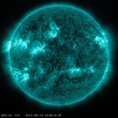 Abbild der Sonne vom 13. Mai 2013. Die starken Masseauswürfe der Sonne sind
