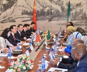 Chinas Premier Li Keqiang (2.v.links) im Gespräch mit der Führung der Afrikanischen Union. Im Unterschied zum Westen macht China Afrika das Angebot wirklicher Ent- wicklung – z.B., ein gesamt- afrikanisches Eisenbahnnetz zu finanzieren und zu bauen.