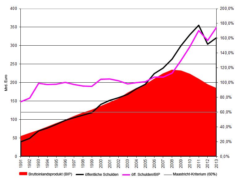 Entwicklung der griechischen Staatsverschuldung 1991-2013 absolut (in Mrd.