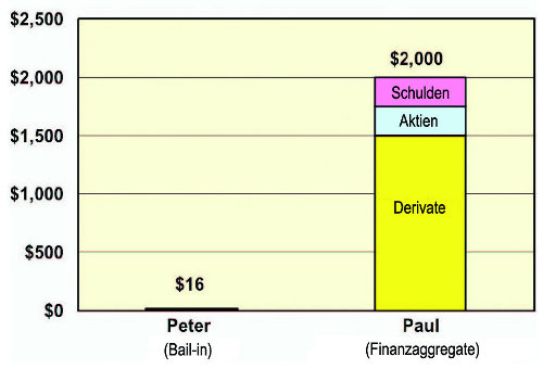 Wir haben damals den Bail-In-Schwindel als „quantitatives Stehlen“ angeprangert und darauf hingewiesen, daß der Bail-in des einen der Bail-out für jemand anderen ist. Die entscheidende Frage ist: Welche Finanzinstrumente sollen durch das quantitative Stehlen anderer Finanzinstrumente gestützt werden? Die Antwort wird in der EU-Richtlinie für die sogenannte „Bankabwicklung“ und im Dodd-Frank-Gesetz ganz klar gegeben: Derivatanlagen der Megabanken sollen nicht angetastet werden, wenn dies „systemische“ Probleme im Weltfinanzsystem auslösen würde - was natürlich immer der Fall wäre. Der Plan ist also, Peter - Sie und Ihre Familie - zu berauben, um Paul - die Wall Street und die Londoner City - zu bezahlen.