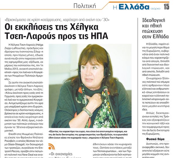 Im Mittelpunkt des Artikels steht der Konferenzbeitrag von Prof. Theodore Katsanevas, ein Foto zeigt Katsanevas im Gespräch mit Lyndon LaRouche. Der Autor des Artikels, Nicolas Laos, hatte früher schon Helga Zepp-LaRouche und den ehemaligen französischen Präsidentschaftskandidaten Jacques Cheminade interviewt. Laos erwähnt in seinem Bericht auch, daß Natalja Witrenko von der Progressiven Sozialistischen Partei und der Eurasischen Volksallianz der Ukraine „und viele andere Persönlichkeiten, Politiker, Ökonomen, Analysten und Aktivisten aus den USA, Rußland, Japan und China“ bei der Konferenz sprachen. Den größten Teil der zweiten Seite des Artikels macht die griechische Übersetzung des Briefs von Helga Zepp-LaRouche an den US-Kongreß für die Verabschiedung des Glass-Steagall-Antrags HR 129 aus, zusammen mit einer großen Photographie der Vorsitzenden des Schiller-Instituts.