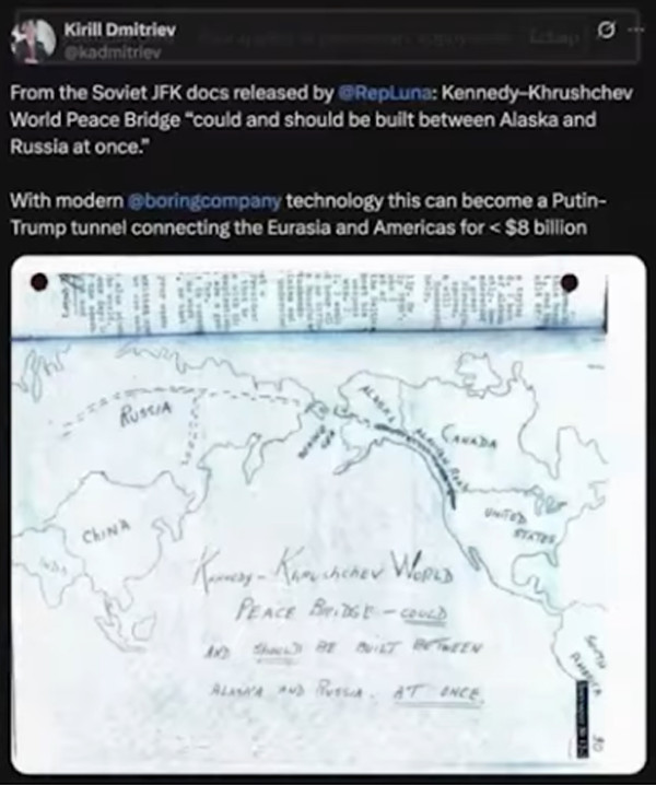 Die Idee tauchte dann Anfang der 1960er Jahre während des Kalten Krieges unter dem Namen „Kennedy-Chruschtschow-Weltfriedensbrücke” wieder auf, wie aus kürzlich in Rußland entdeckten sowjetischen Dokumenten hervorgeht, dort steht: „Könnte und sollte gemacht werden!” (Abbildung 4)