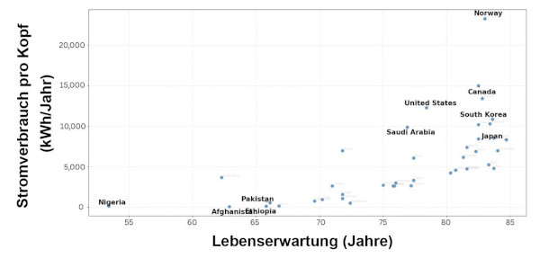 Pro-Kopf-Stromverbrauch in kWh und der Lebenserwartung in den einzelnen Ländern.