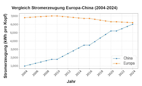 Abb. 3: Pro-Kopf-Stromerzeugung: China vs. Europa (2004–2024)