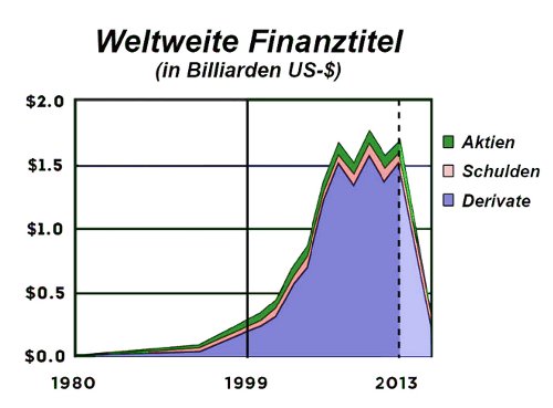 Um welche Größenordnungen geht es bei der implodierenden Spekulationsblase? 1999, als das Glass-Steagall-Gesetz aufgehoben und durch das Gramm-Leach-Bliley-Lewinsky-Gesetz ersetzt wurde, standen die Finanzaggregate insgesamt weltweit bei 275 Billionen Dollar. Heute ist diese Blase auf etwa 1,7 Billiarden Dollar angewachsen - eine Versechsfachung in 14 Jahren! Infolgedessen ist zu erwarten, daß sich etwa 1,4 Billiarden Dollar an wertlosen Finanzpapieren in Luft auflösen werden (Abbildung 2).