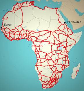 Hier ist eine sehr anschauliche Karte (Abbildung 12a) aus unserer Weltlandbrückenstudie. Sie zeigt den Zustand des afrikanischen Eisenbahnnetzes vor einigen Jahren, als es nur Eisenbahnen von den Häfen zu den Minen gab, weil das alles war, woran die Kolonialmächte interessiert waren – Rohstoffe aus dem Land zu schaffen. Daneben (Abbildung 12b) sehen Sie das sich entwickelnde Eisenbahnnetz von Afrika heute, das vor allem von China ausgebaut wird, kreuz und quer über den ganzen Kontinent. Bald wird man in Afrika per Bahn von einer Hauptstadt in alle anderen Hauptstädte gelangen können, um wirkliche Nationen aufzubauen, statt sie rückständig zu halten, damit sie keine Alternative haben, als uns ihre Rohstoffe zu verkaufen. Auch die Chinesen brauchen Rohstoffe, aber sie bezahlen auch dafür, indem sie die Länder aufbauen, die diese Rohstoffe liefern, damit diese Länder die Mittel haben, sich zu entwickeln, statt weiter rückständig zu bleiben und in Schulden zu ersticken.