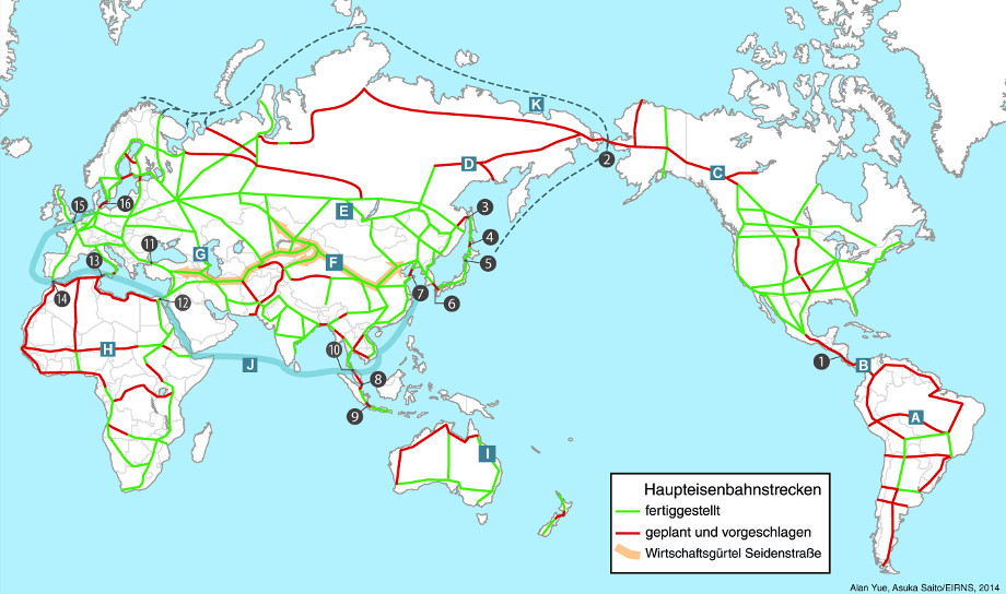 Als Xi Jinping 2013 seine Belt & Road-Initiative ankündigte, stellten wir eine 370seitige Studie zusammen, um die Seidenstraße zur Weltlandbrücke zu erweitern (Abbildung 15). Sie wurde inzwischen ins Chinesische, Arabische und Deutsche übersetzt und wird demnächst auch auf Koreanisch erscheinen. Die Idee ist, daß die Weltlandbrücke die Grundlage ist, auf der wir eine Welt schaffen können, die nicht geopolitisch ist, die keine darwinistische Welt ist, in der einer den anderen auffrißt und eine Nation nur auf Kosten anderer Nationen gewinnen kann. Stattdessen können wir eine Welt haben, die sich daran orientiert, die gemeinsamen Ziele der Menschheit zu verwirklichen, und die die Menschheit in das Erwachsenenalter der menschlichen Gattung führt, heraus aus ihrer Kindheit als Gattung, in der wir uns jetzt noch befinden, wo wir uns wie kleine Kinder verhalten, die sich gegenseitig mit Schlamm bewerfen, anstatt wie eine wahrhaft menschliche Gattung.