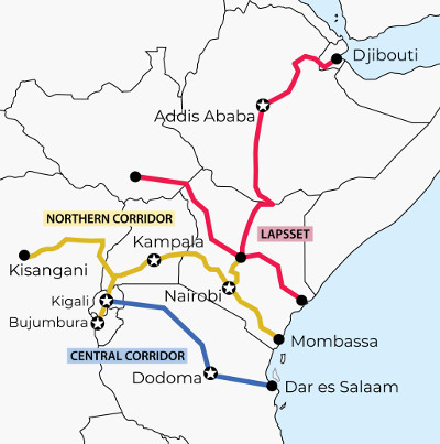 Dies (Abbildung 3) ist eine Karte des afrikanischen Netzes von Hochgeschwindigkeitsbahnen (Abbildung 4), wie wir es uns vorstellen. Dieser Plan existiert bei der Afrikanischen Union schon seit vielen, vielen Jahren, aber er zeigt Autobahnen, die nie gebaut wurden. Nun jedoch werden Schritt für Schritt Eisenbahnen gebaut, wie die Eisenbahn Dschibuti-Addis Abeba, die 2017 mit Chinas Hilfe fertiggestellt wurde. Es gibt die Eisenbahn Mombasa-Nairobi, die im vergangenen Jahr festiggestellt wurde (Abbildung 5). Diese Projekte brechen alle früheren Rekorde, was den Bau an geht, die Geschwindigkeit, die Effizienz und die Kosten. Der Plan, von dem die Afrikanische Union träumt und für den sie Pläne erstellt hat, wird nun verwirklicht (Abbildung 6). Die sprichwörtlichen Spatenstiche werden getan. Es ist nichts, was erst irgendwann in der Zukunft geschehen wird.