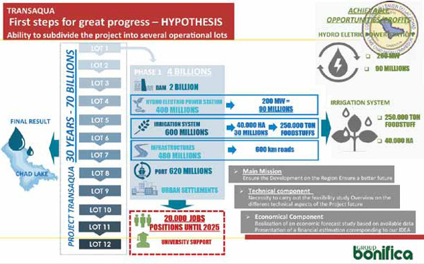 Der Transaqua-Vorschlag besteht in einer 2400 km langen Wasserstraße, um 30-50 Mrd. m3 Wasser aus den rechten Nebenflüssen des Kongo in den Tschadsee zu leiten. Bei dem ursprünglichen Vorschlag, der in den 1980er Jahren von dem italienischen Ingenieur Marcello Vichi kam, schätzte man, daß man 100 Mrd. m3 Wasser aufnehmen und zum Tschadsee leiten könnte. Aber seit damals bis heute hatten wir ständige Dürre, deshalb geht man allgemein davon aus, daß wir wahrscheinlich nicht auf 100 Mrd. m3 kommen werden, aber den rechten Nebenflüssen des Kongo zwischen 30 und 50 Mrd. m3 Wasser entnehmen können, um sie zum Tschadsee zu leiten. Man erwartet, daß das Projekt sieben afrikanischen Ländern direkten wirtschaftlichen Nutzen schafft und fünf weiteren Ländern, die mit den Becken des Kongo und des Tschadsees verbunden sind, indirekten Nutzen bringen wird.