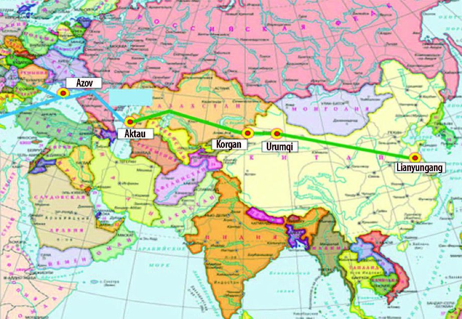 Und natürlich haben wir eine Initiative gesehen, die vom Staatschef der Volksrepublik China, Xi Jinping, ausgeht. Seit 2013 setzt er sich aktiv für „Ein Gürtel, eine Straße“ ein, wie es die Chinesen nennen. Auch der Eurasische Seidenstraßen-Kanal ist eine Initiative. Eurasien-Kanal ist eine Kurzbezeichnung für das Nurly-Zhol-Projekt, ein strategisches russisches Verkehrsprojekt. Wenn man sie miteinander verbindet, werden diese Projekte einen multimodalen Verkehrskorridor schaffen, der durch das Territorium von China, Kasachstan und Rußland führt (Abbildung 1), entlang der Strecke vom Hafen Lianyungang (China) über Korgan, Dostyk zum Hafen Aktau (Kasachstan) und weiter durch den Eurasien-Kanal zum Becken des Asowschen Meeres und des Schwarzen Meeres (Rußland).