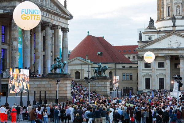 Und schließlich sang gegen Ende des Festivals das Publikum drinnen und draußen gemeinsam die „Ode an die Freude“, nachdem das European Union Youth Orchestra, der Ernst-Senff-Chor und die Solisten unter Leitung von Vasiliy Petrenko bravourös Beethovens 9. Symphonie aufgeführt hatten – mit modernster Technik gleichzeitig live auf den Gendarmenmarkt übertragen.