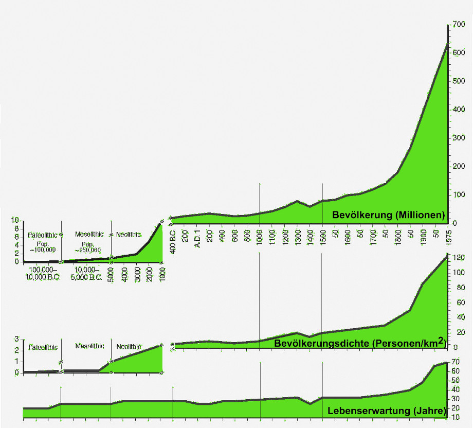 Wir beginnen mit einem Diagramm der menschlichen Bevölkerung in der Geschichte. Es gibt keine Tierart, deren Population sich in dieser Weise verändert hat, und keine, deren Population sich durch bewußte Veränderungen im Verhalten und in der Beziehung zur Natur verändert hat. Und das ist gut so! Jeder, der denkt, daß wir unser Verhältnis zur Natur nicht ständig verändern und verbessern sollten, ist ein Dummkopf.