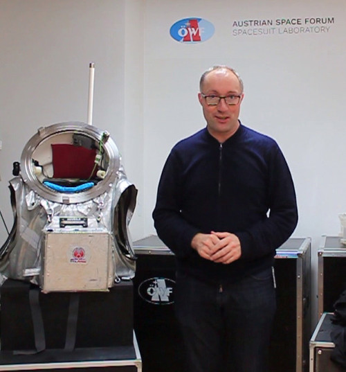 Neben mir sehen Sie ein Modell, genauer gesagt ein Oberteil, des Raumanzug-Simulators AOUDA.X. Das ist ein experimentelles Raumschiff zum Anziehen, sozusagen, der bereits in zwölf Mars-Simulationen weltweit eingesetzt wurde, wie etwa letztes Jahr in der Dhofar-Region in der Wüste des Oman. Und nächstes Jahr geht es auf nach Israel, in die Negev-Wüste, dort gibt es auch einige sehr Mars-ähnliche Umgebungen, die für uns als Test-Gelände verwendet werden.