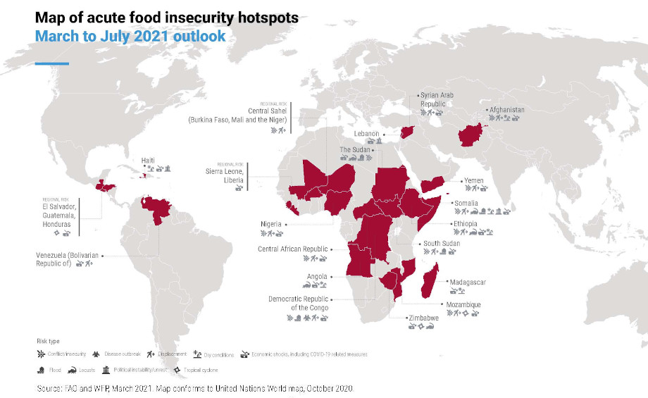 Diese Weltkarte des Hungers (Abbildung 1) zeigt – in den dunkelsten Rottönen – die Nationen mit dem extremsten Hunger. Das Zentrum ist in Afrika, aber auch, weniger sichtbar auf der Karte, im Jemen, in Haiti, der Karibik und anderen Teilen der Welt. In über 30 Ländern herrscht Hunger und extreme Armut. Die Zahl liegt jetzt in diesen mehr als 30 Ländern bei 270 Millionen. Allein im Jemen sind 20 Millionen Menschen dringend auf Nahrung angewiesen. Aber schon vor der Pandemie gab es mehr als 800 Millionen Menschen, die nicht genug zu essen hatten oder nicht wußten, ob sie morgen noch etwas zu essen haben werden.