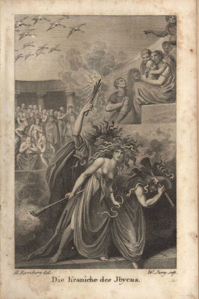 In diesem Moment fragen sich die Zuhörer: Werden die Rachegeister den Mörder unseres geliebten Dichters Ibykus aufspüren? Die Mörder selbst aber halten es für klug, im Gewühl des Volkes unterzutauchen. Da sie rauhe sinnliche Kerle sind, die Theater als Hokuspokus verachten, sitzen sie auf den oberen Stufen und schauen gelangweilt in die Ferne. Da will es der Zufall, daß ein Kranichheer über das Theater fliegt. Weil sie erhöht sitzen, sehen sie sie als erste.