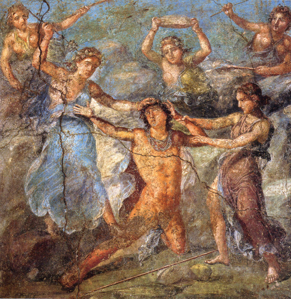 Im antiken Griechenland setzte die Oligarchie auf den Kult des Gottes des Weins, Dionysos. Er stellte mit den rasenden Frauen (Mänaden) eine Gefahr für die Staatsordnung dar. Ordnungsbedrohend war das Irrationale, das ihn auszeichnete. In der dionysischen Ekstase wollte man mittels Musik, Tanz und Rauschmitteln aus der Rationalität ausbrechen; ein anderer Weg war die Sexualität. Der Phallus war das Symbol des Dionysos. In orgiastischer Tanzwut, vielleicht den Veitstänzen des Mittelalters vergleichbar, drehten sich die Mänaden wirbelnd im Tanz, bis sie berauscht in Verzückung zu Boden sanken und in höchster Verzückung ein Tier ergriffen, es in Stücke rissen und das rohe Fleisch verschlangen. In seinem Stück Die Bakchen beschreibt der Tragödiendichter Euripides (480-407 v.Chr.), daß selbst der Staatsführer Pentheus in orgiastischen Riten in Stücke gerissen wird (Abbildung 1). Es war ein Hinübertreten ins Animalische oder wie man christlich sagen würde, ins Satanische. Auch die Masken und Verkleidungen, die mit dem Kult einhergingen, wie Reh- oder Ziegenfelle, bezeugten den Wunsch nach Aufgabe der menschlichen Individualität.
