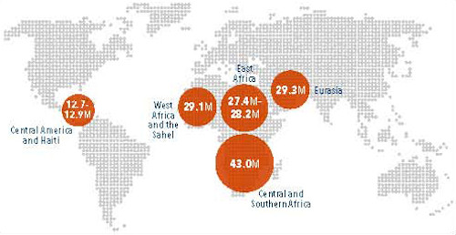 Diese Karte (Abbildung 1) zeigt die Lage der Ärmsten, der 270 Millionen Menschen, die nicht genug zu essen haben. Besonders betroffen sind 142 Millionen Menschen in 40 Ländern, die sich in einer sogenannten „Krisen-, Not- oder Katastrophen-Hungersnot“ befinden. Im südlichen Afrika: 43 Millionen, in Ostafrika: 28 Millionen, in Westafrika und der Sahelzone: 29 Millionen. In Südwestasien: 29 Millionen – Jemen, Syrien, Afghanistan. Auf dem amerikanischen Kontinent: 13 Millionen. David Beasley vom Welternährungsprogramm warnt, daß in den kommenden Monaten 34 Millionen Menschen verhungern könnten.