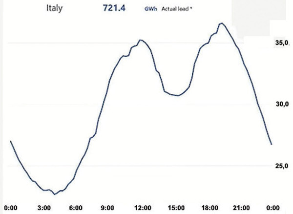 Darin sehen Sie eine Grundlast, die im ausgewählten Fall etwa 20 GW beträgt: Am 15. Dezember 2024 verbrauchte Italien mindestens 20 GW Strom. Um genau zu sein, wurden um 3 Uhr morgens genau 20 GW verbraucht, aber im Laufe des Tages stieg der Strombedarf an und erreichte gegen 19 Uhr einen Spitzenwert, der in diesem Beispiel bei etwa 40 GW lag. Durch Ändern des Landes oder des Tages können sich die Zahlenwerte des Strombedarfs ändern (in Italien kann der Bedarf beispielsweise um 19 Uhr sogar 60 GW erreichen). Wichtig ist, daß überall auf der Welt und an jedem Tag des Jahres um 18/19 Uhr der tägliche Spitzenbedarf an Strom erreicht wird.