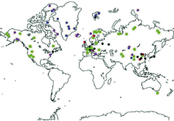 Wir hatten das Gefühl, daß es notwendig sein würde, längere Zeiträume zu analysieren, als dies normalerweise in offiziellen Verlautbarungen der Fall ist. Wir beschlossen, daß wir Daten für etwa 2000 Jahre zum Erdklima benötigen würden. Nun kann man das Klima der Erde für 2000 Jahre nicht einfach in der Literatur nachschlagen, also mußten wir es aus verschiedenen lokalen Quellen rekonstruieren. Auf Abbildung 1 sehen Sie die verschiedenen Orte, an denen lokale Untersuchungen durchgeführt wurden. Wir haben sie alle zusammengeführt, um globale Klimadaten von 2000 Jahren zu erstellen. Die verschiedenen Farben zeigen nur, welche Art von Forschung durchgeführt wurde, um die Temperaturen an den verschiedenen Orten zu ermitteln.