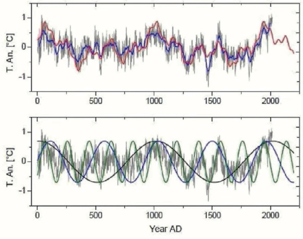 Hier müssen wir zu Abbildung 2 zurückkehren. In dem unteren Diagramm sind die drei Zyklen dargestellt, die wir zuvor im Spektrum gesehen haben. Sie sehen, daß diese drei Zyklen den grauen Wertmessungen überlagert sind. Wenn wir nun diese Zyklen addieren, da sie in der Natur gleichzeitig auftreten, und zum oberen Diagramm zurückkehren, sehen wir, daß die rote Kurve die Summe der drei Zyklen im unteren Diagramm ist. Wenn Sie sich das ansehen, können Sie erkennen, daß die rote Kurve und die blaue Kurve, die das Klima darstellt, genau übereinstimmen. Insbesondere die rote Kurve als Summe der drei Zyklen entspricht genau dem Temperaturanstieg der letzten 150 Jahre, der angeblich durch CO2 verursacht wird. In Wirklichkeit ist es nichts anderes als das Ergebnis dieser drei Zyklen, die gleichzeitig auftreten.