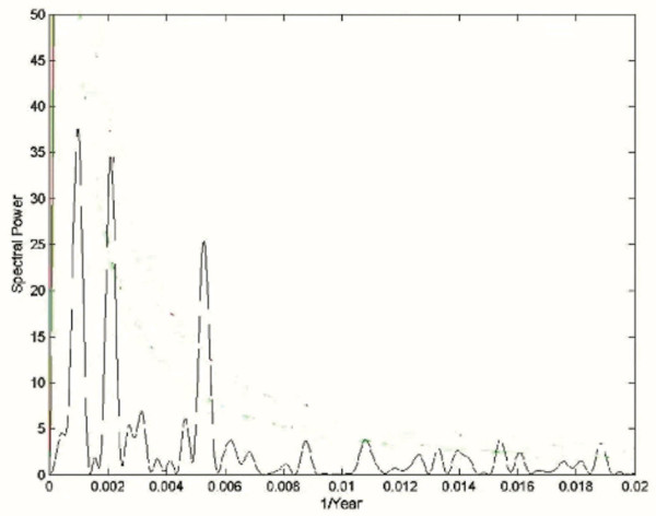 Nun wollen wir es analysieren. Die Idee war, Zyklen zu betrachten. Das ist etwas, was jeder Physiker, jeder Ingenieur als erstes tut, wenn er mit unregelmäßig aussehenden Größen konfrontiert wird. Dafür gibt es einen guten Grund. Ich werde nicht ins Detail gehen, aber aus guten Gründen ist das Auftreten von Zyklen in der Welt und in der Physik ein sehr häufiges Phänomen. Wir haben also die grauen Werte genommen und eine sogenannte Fourier-Transformation angewendet, mit der man herausfinden kann, ob es Zyklen gibt oder nicht. Auf Abbildung 3 sehen Sie ein sogenanntes Spektrum, und Sie sehen, daß das gesamte Spektrum im wesentlichen aus drei markanten Zyklen besteht; der Rest ist sozusagen nur Rauschen. Wenn wir uns die Zeiträume dieser drei markanten Zyklen ansehen, stellen wir fest, daß sie genau mit den bereits aus lokalen Messungen bekannten Zeiträumen übereinstimmen. Das ist eine weitere Bestätigung dafür, daß unsere Darstellung des globalen Klimas wahrscheinlich zuverlässig ist.