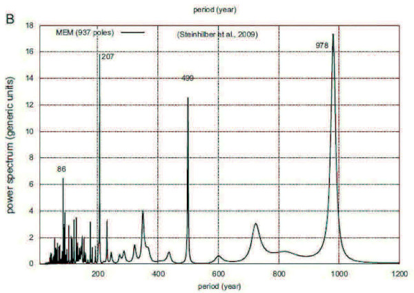 Wenn wir genauer hinschauen, können wir diese drei Zyklen mit der Sonnenaktivität in Verbindung bringen. Abbildung 4 zeigt ein Spektrum der Sonnenaktivität über 8000 Jahre, und wir sehen, daß die drei Hauptzyklen genau mit den Perioden des globalen Klimas übereinstimmen. Der Zusammenhang zwischen Sonnenaktivität und Erdklima ist durch die Arbeiten von Svensmark sehr gut bekannt, sodaß wir die Klimazyklen der Erde mit den Sonnenaktivitätszyklen in Verbindung bringen können.
